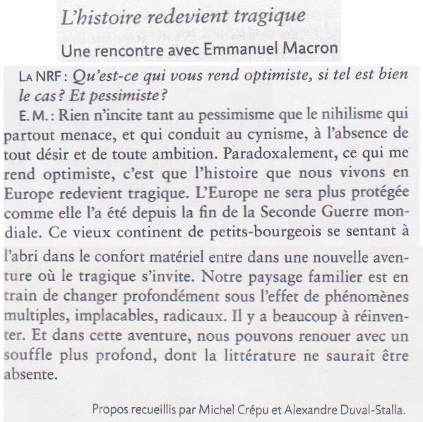 (...) ce qui me rend optimiste, c'est que l'histoire que nous vivons en Europe redevient tragique. L'Europe ne sera plus protégée comme elle l'a été depuis la fin de la Seconde Guerre mondiale. Ce vieux continent de petits-bourgeois se sentant à l'abri dans le confort matériel entre dans une nouvelle aventure où le tragique s'invite." p 85 86 Interview d'Emmanuel Macron par Michel Crépu et Alexandre Duval Stalla dans La Nouvelle Revue française (extrait de la revue dans mon article Macron avoue "...ce qui me rend optimiste, c'est que l'histoire que nous vivons en Europe redevient tragique. L'Europe ne sera plus protégée comme elle l'a été depuis la fin de la Seconde Guerre mondiale" #1anMacron d'application du plan JP Morgan)